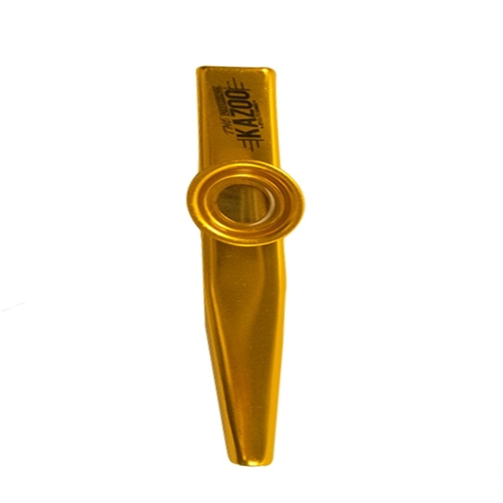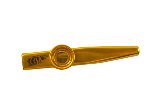 O Kazoo Profissional Elite dourado da Turbo é um instrumento de sopro que adiciona um timbre de zumbido à voz do instrumentista quando se vocaliza no instrumento. O kazoo é um tipo de mirlitão, um dispositivo que modifica o som da voz de uma pessoa através de uma membrana vibratória.